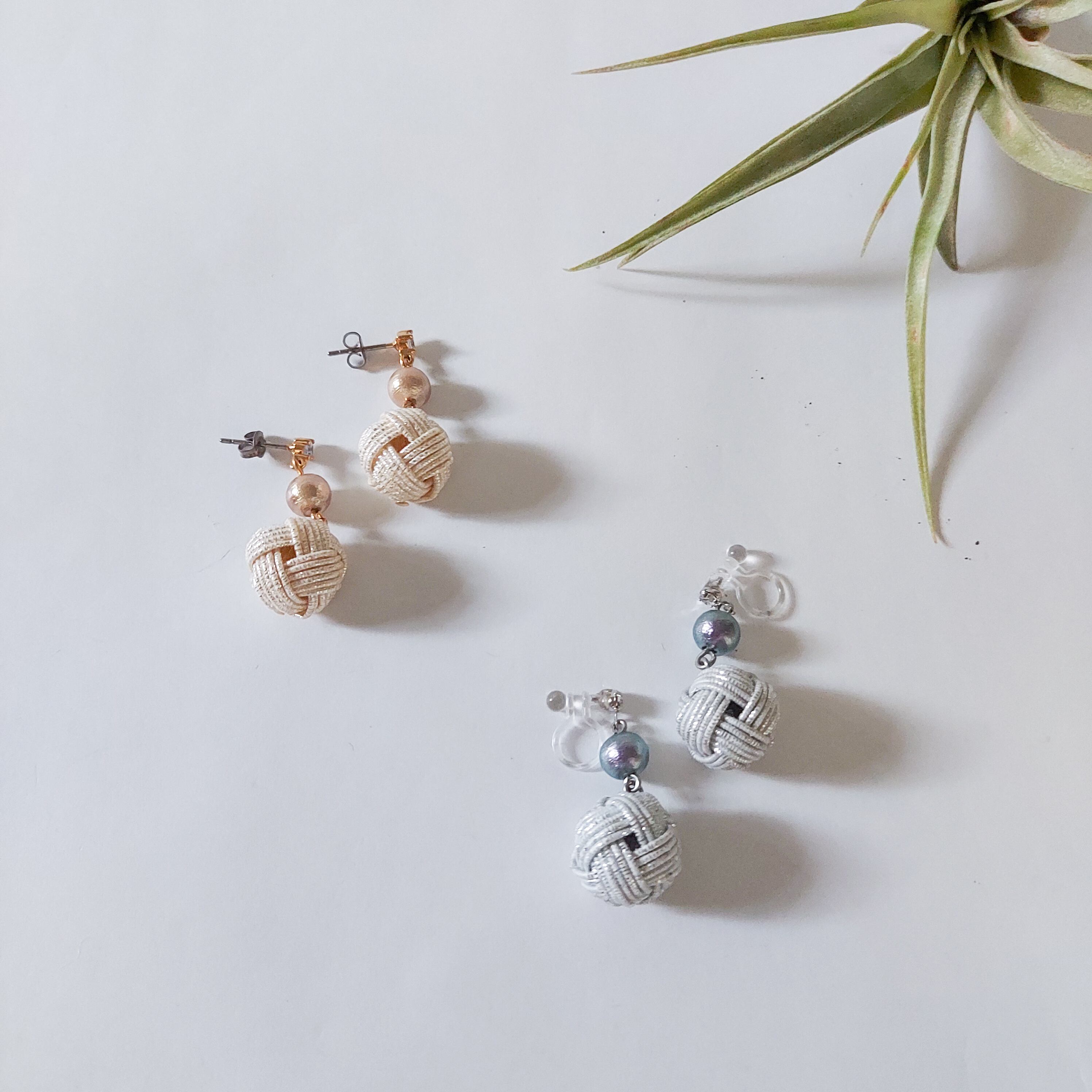 コットンパールといっしょに揺れるピアスとイヤリングです。